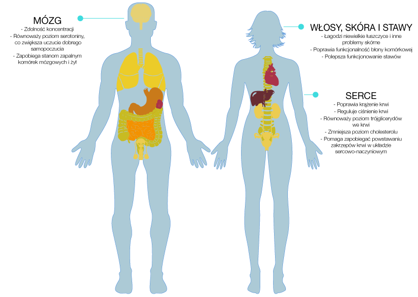 Jest naukowo udowodnione, że kwasy tłuszczowe Omega-3 są dobre dla serca i naczyń. Brak kwasów tłuszczowych EPA i DHA negatywnie wpływa na stężenie tłuszczów we krwi i zwiększa ryzyko chorób układu krążenia.