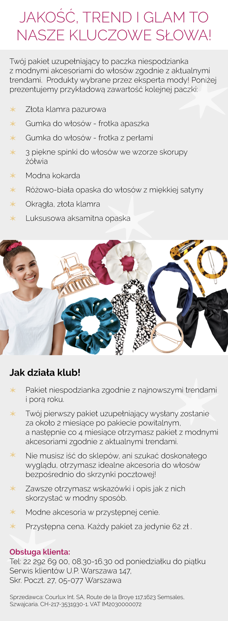 • Co 4 miesiące, otrzymasz pakiet niespodziankę z modnymi akcesoriami zgodnie z aktualnymi trendami w modzie .